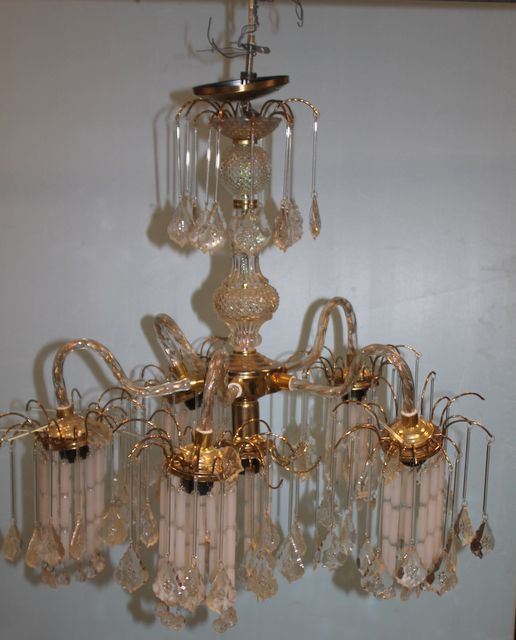 147 Five Arm Brass Chandelier with Plastic Prisms 27"dia., 23"h.