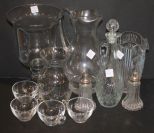 153 Lot of Glass shakers, cups, two pitchers, decanter, and vases.