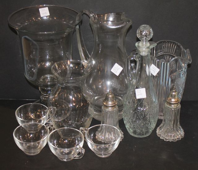 Lot of Glass shakers, cups, two pitchers, decanter, and vases. Lot of Glass shakers, cups, two pitchers, decanter, and vases.