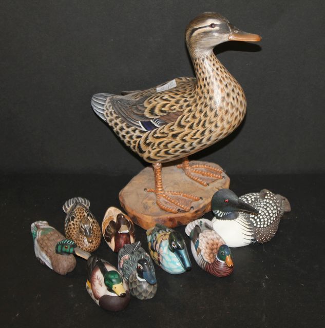 156 Painted Carved Duck with 8 Small Painted Ducks duck 10"h., small damage on small ducks.