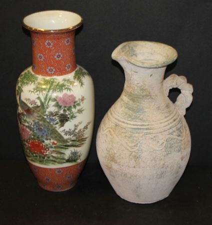 Pottery Pitcher and Porcelain Painted Vase Pottery Pitcher and Porcelain Painted Vase