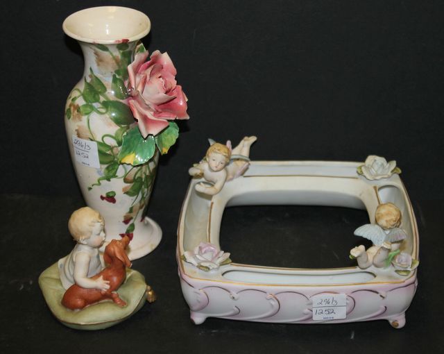296 Italian Ceramic Vase with Applied Flowers, Italian Figurine of Bay and Day, Porcelain Square Flower Vase