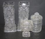 299 Two Press Glass Vases, Small Candy Dish, and Covered Jar Vases 10"h.