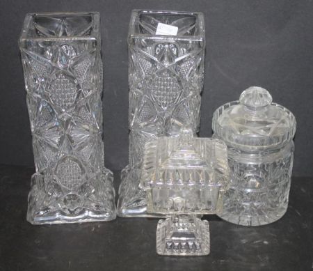 Two Press Glass Vases, Small Candy Dish, and Covered Jar Vases 10"h. Two Press Glass Vases, Small Candy Dish, and Covered Jar Vases 10"h.