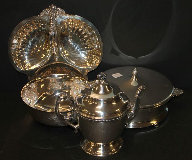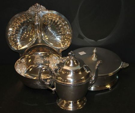 Group of Silverplate teapot, bowl, and trays Group of Silverplate teapot, bowl, and trays