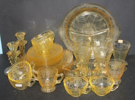 Collection of Yellow Depression Glass candlesticks, plates, cups, divided dishes, glasses, and creamer/sugars. Collection of Yellow Depression Glass candlesticks, plates, cups, divided dishes, glasses, and creamer/sugars.