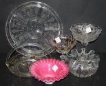 407 Group of Glass insert of brides basket 2" base, two compotes, etched dish, and bowl.
