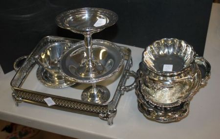 410 Group of Silverplate Compotes, gravy, trays, and casserole frame
