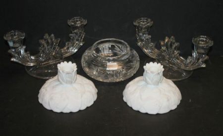 Fenton Milk Glass Candlesticks, Cut Glass Jar, Pair of Candlesticks jar (no lid) 5"dia., candlesticks 8"w., 4"h. Fenton Milk Glass Candlesticks, Cut Glass Jar, Pair of Candlesticks jar (no lid) 5"dia., candlesticks 8"w., 4"h.