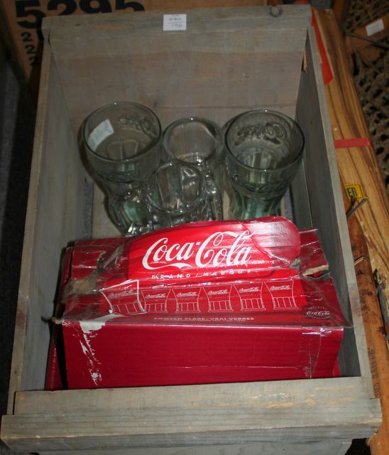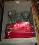 Crate with glass Mugs and 8"-3"h. Coca-Cola Glasses in box Crate with glass Mugs and 8"-3"h. Coca-Cola Glasses in box