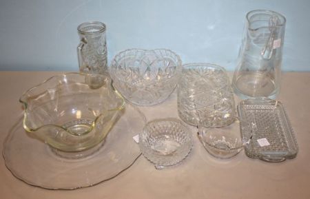 512 Glass Lot Pitcher, large tray, bowls, and shoe vase