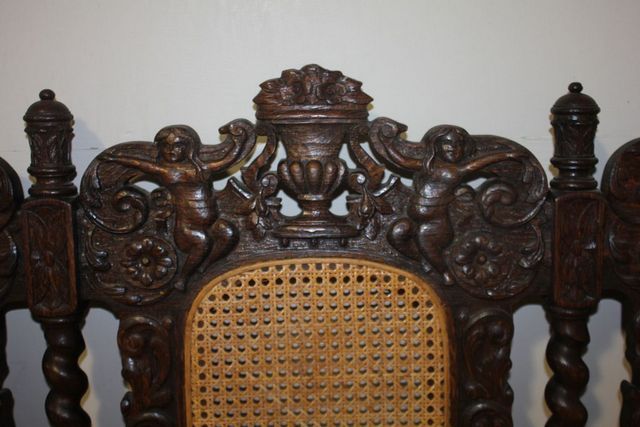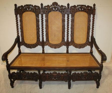 549 Victorian Oak Carved Settee Ornate Victorian oak leaf, barley twist, cupid carved settee in original oak finish, cane seat, and back also has embossed velvet cushion; 63" w., 25 1/2" d., 57" h.