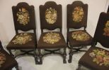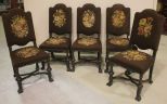 Set of Five Walnut William and Mary Carved Side Dining Chairs Set of walnut William and Mary carved chairs with needlepoint seats and backs; 20" w., 18" d., 42"h. Set of Five Walnut William and Mary Carved Side Dining Chairs Set of walnut William and Mary carved chairs with needlepoint seats and backs; 20" w., 18" d., 42"h.
