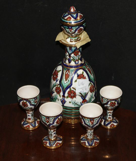 616 Kutahia Athens Decanter and Four Glasses Made in Greece, has chip on base of decanter; 9 1/2" h.