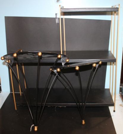 630 Metal and Brass Three Tier Stand and Two Wall Brackets Stand 24" w,, 9" d., 25" h., brackets 11" h. 14" w.