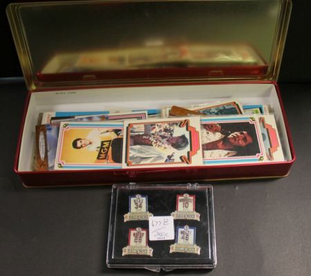 677 Elvis Trading Cards and Baseball Cards Elvis Christmas tin with various 1978 Elvis trading cards and various baseball cards, Four Texas Rangers 2003 Hall of Fame pins