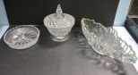 Candy Dish, Center Bowl, and Divided Bowl Candy dish with lid 8" h., clear center bowl 15" l., 4" h., and divided bowl 8" d. Candy Dish, Center Bowl, and Divided Bowl Candy dish with lid 8" h., clear center bowl 15" l., 4" h., and divided bowl 8" d.