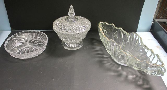 681 Candy Dish, Center Bowl, and Divided Bowl Candy dish with lid 8" h., clear center bowl 15" l., 4" h., and divided bowl 8" d.