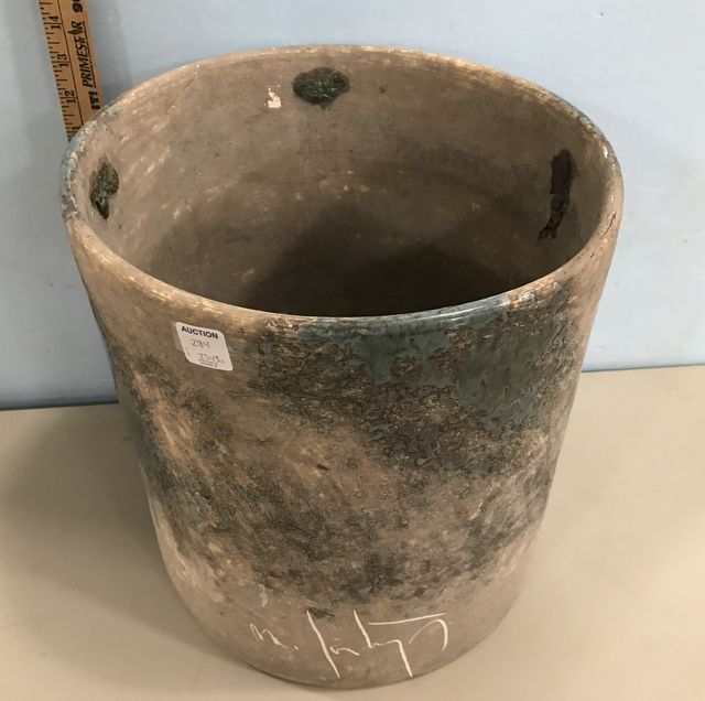 McCarty Pottery Planter, glazed, age wear, signed McCarty, has drain hole, 13"h., 12"dia. McCarty Pottery Planter, glazed, age wear, signed McCarty, has drain hole, 13"h., 12"dia.