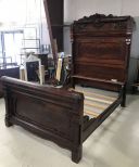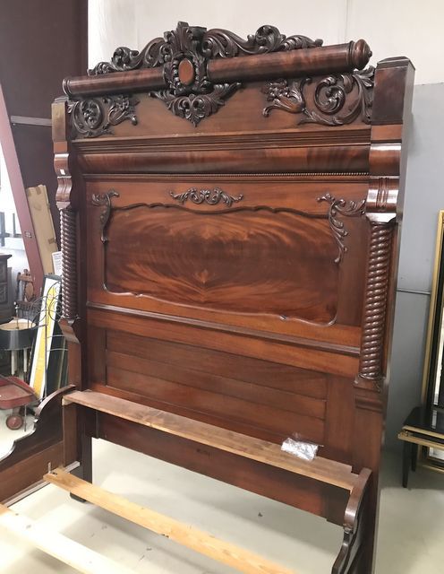 Antique Victorian Style High Back Bed, has some wear, carved carved and trim, twist style columns, 60" wide, 90"tall, (queen). Antique Victorian Style High Back Bed, has some wear, carved carved and trim, twist style columns, 60" wide, 90"tall, (queen).