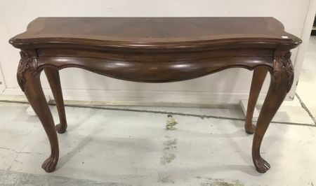 Thomasville Modern French Style Wall Console, carved leg decor, serpentine shaped top, burl finish with inlaid design, good condition, 34"h., 60"w., 22"d. Thomasville Modern French Style Wall Console, carved leg decor, serpentine shaped top, burl finish with inlaid design, good condition, 34"h., 60"w., 22"d.