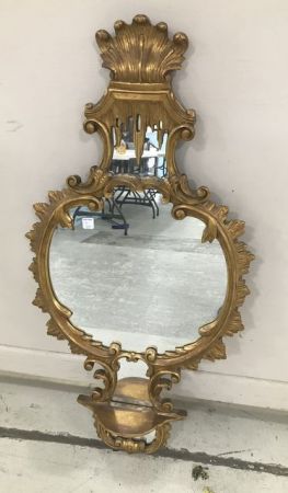 Heavy Carved Gold Leaf Wall Mirror, unique shapes and designs, mirrored, with display shelf, 43"h., 21"w. Heavy Carved Gold Leaf Wall Mirror, unique shapes and designs, mirrored, with display shelf, 43"h., 21"w.