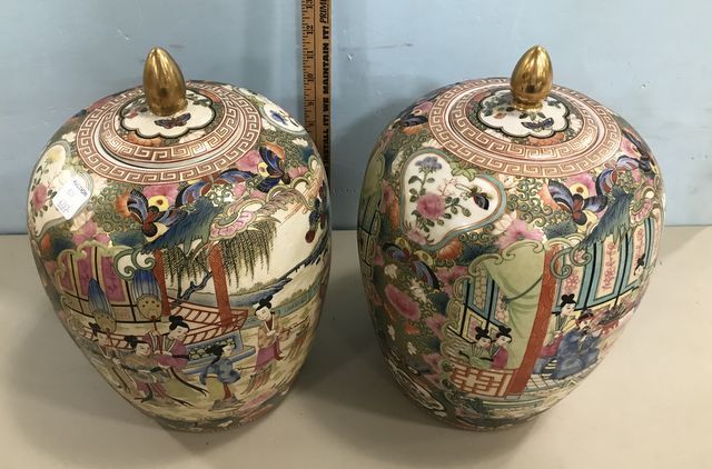 Pair of Chinese Ginger Jars, modern decor, hand painted jars with lids, 15"h. Pair of Chinese Ginger Jars, modern decor, hand painted jars with lids, 15"h.