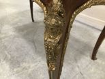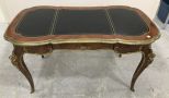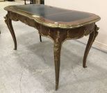 French Empire Desk Bureau Plat Writing Table, Scalloped Edge, circa 1930s, ormolu trim work and lady figures, leather inset top some loose edges, good condition, 55"w., 29"d., 30"h. French Empire Desk Bureau Plat Writing Table, Scalloped Edge, circa 1930s, ormolu trim work and lady figures, leather inset top some loose edges, good condition, 55"w., 29"d., 30"h.