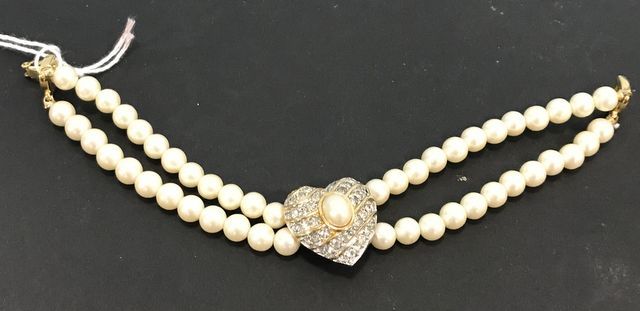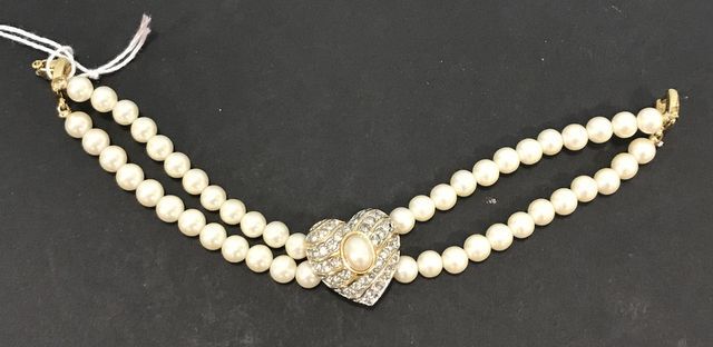 Vintage Double Strand Faux Pearl rhinestone heart bracelet, marked Richelieu. Vintage Double Strand Faux Pearl rhinestone heart bracelet, marked Richelieu.