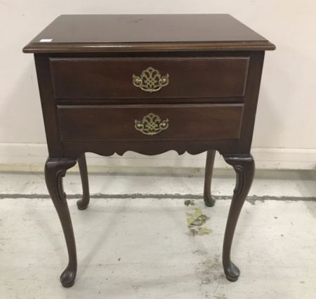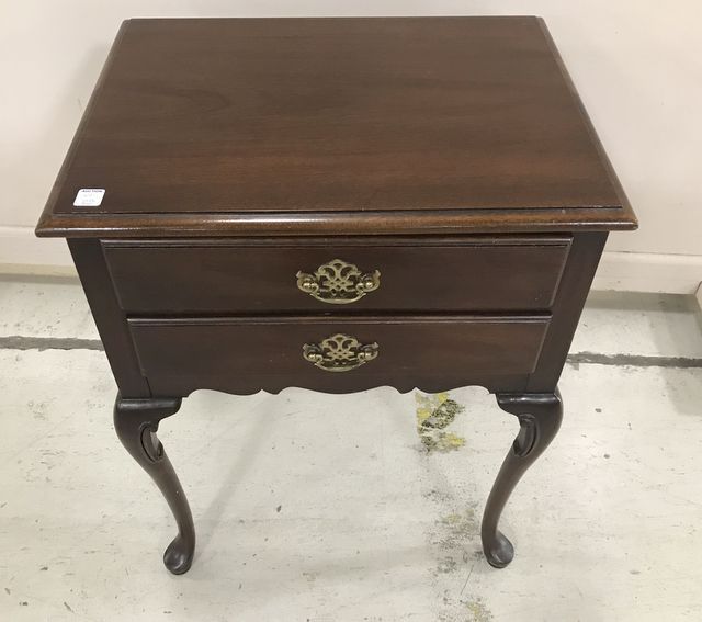 Cherry Queen Anne Night Stand, modern reproduction, two drawers, brass pulls, has some finish wear, 30"h., 22"w., 17"d. Cherry Queen Anne Night Stand, modern reproduction, two drawers, brass pulls, has some finish wear, 30"h., 22"w., 17"d.