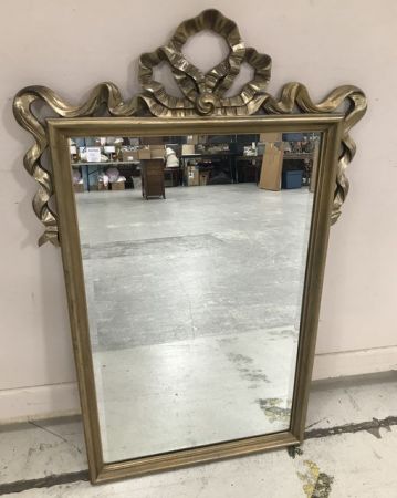 Carolina Mirror Company Antiqued Gold Gilt Wall Mirror, modern decor, ribbon crest, beveled mirror, 44"h., 28"w. Carolina Mirror Company Antiqued Gold Gilt Wall Mirror, modern decor, ribbon crest, beveled mirror, 44"h., 28"w.