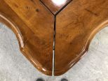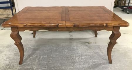Country French Gathering Dinning Table, French style carved border shapes and legs, does extend but no leaves, has some wear, one corner peg in separating, 30"h., 72"w., 44"d. Country French Gathering Dinning Table, French style carved border shapes and legs, does extend but no leaves, has some wear, one corner peg in separating, 30"h., 72"w., 44"d.