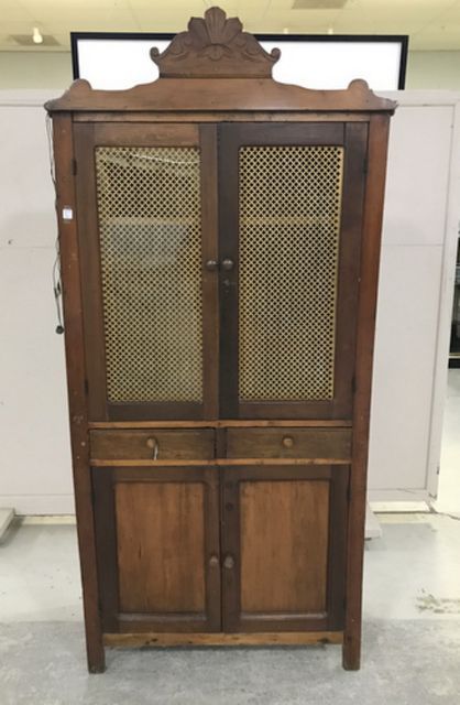 Vintage walnut pie safe cabinet, double door with mesh screen panels, single shelf, two drawer, bottom double door with single storage shelf, has carved crest, also christmas light lined in the inside, needs some work, 82"h., 37"w., 15"d. Vintage walnut pie safe cabinet, double door with mesh screen panels, single shelf, two drawer, bottom double door with single storage shelf, has carved crest, also christmas light lined in the inside, needs some work, 82"h., 37"w., 15"d.