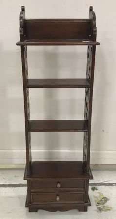 Vintage Oriental Style Small Book Shelf, four shelves, two drawers, carved design sides, 41"h., 15"d. Vintage Oriental Style Small Book Shelf, four shelves, two drawers, carved design sides, 41"h., 15"d.