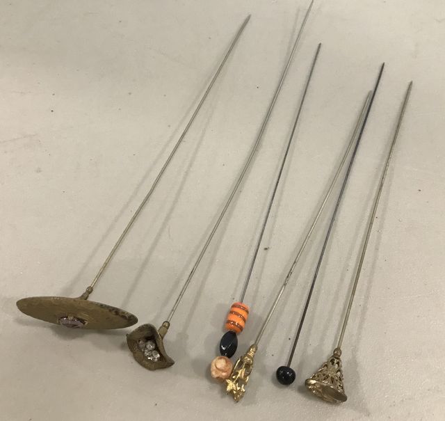 Six Antique Hat Pins, ornate brass, beaded styles. Six Antique Hat Pins, ornate brass, beaded styles.