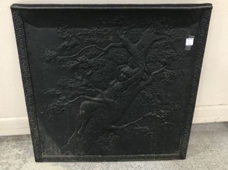 Fireback Iron Cover with Lady of Tree Design, heavy, good condition, came from house out of Arkansas, 26"h., 27"w. Fireback Iron Cover with Lady of Tree Design, heavy, good condition, came from house out of Arkansas, 26"h., 27"w.