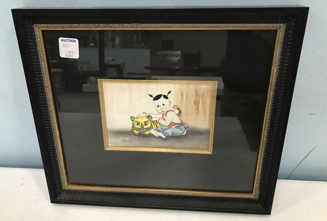Pen and Watercolor Asian Child with Foo Dog Signed, matted, glassed, frame is 11 1/2"h., 13"w. Pen and Watercolor Asian Child with Foo Dog Signed, matted, glassed, frame is 11 1/2"h., 13"w.