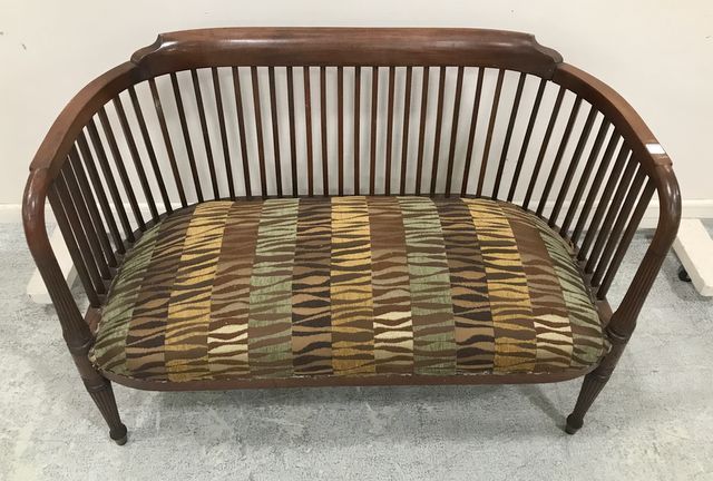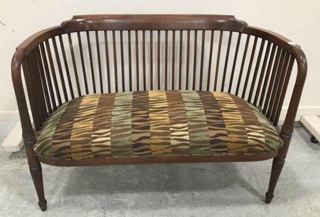 Vintage Spindle Back Deacons Bench, mahogany, has some damage areas, cushion seat, 29"h., 41"w., 19"w. Vintage Spindle Back Deacons Bench, mahogany, has some damage areas, cushion seat, 29"h., 41"w., 19"w.