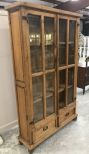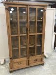 Double Door Mexico Made Bookcase, glass doors, two drawers, three shelves, on feet, missing one glass panel, 78"h., 44"w., 11"d. Double Door Mexico Made Bookcase, glass doors, two drawers, three shelves, on feet, missing one glass panel, 78"h., 44"w., 11"d.