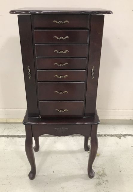 Modern Queen Anne Style Jewelry Cabinet, lift top with mirror, 7 drawers, double side storage, 39"h., 16"w., 11"d. Modern Queen Anne Style Jewelry Cabinet, lift top with mirror, 7 drawers, double side storage, 39"h., 16"w., 11"d.