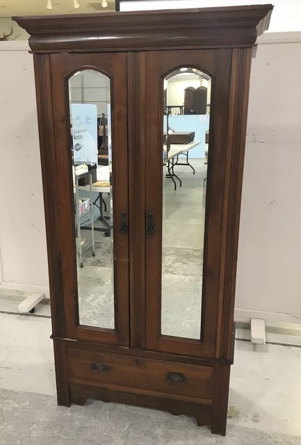 Vintage Double Door English Armoire, three piece, bottom, middle, and top crest. Beveled mirrored doors, one drawer, two shelves, 76"h., 36"w., 15"d. Vintage Double Door English Armoire, three piece, bottom, middle, and top crest. Beveled mirrored doors, one drawer, two shelves, 76"h., 36"w., 15"d.