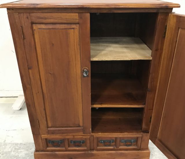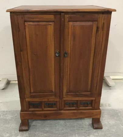 Antique Reproduction Double door Cabinet, two shelf, two drawers, footed, has finish wear, 50"h., 35"w., 24"d. Antique Reproduction Double door Cabinet, two shelf, two drawers, footed, has finish wear, 50"h., 35"w., 24"d.