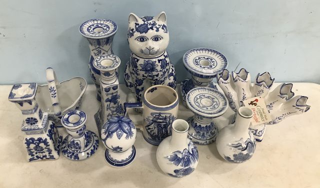 Collection of Blue and White Decor Pottery, Vases, candle holders, Portugal flute vase, cat pottery jar, basket, mug. Collection of Blue and White Decor Pottery, Vases, candle holders, Portugal flute vase, cat pottery jar, basket, mug.