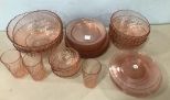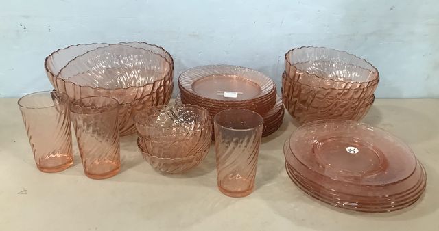 Set Arcoroc France Pink Glass, four bowls, 3 cups, 4 middle bowls, 4 small bowls, 8 salad plates, 8 dessert plates, and etched pink glass plates. Set Arcoroc France Pink Glass, four bowls, 3 cups, 4 middle bowls, 4 small bowls, 8 salad plates, 8 dessert plates, and etched pink glass plates.