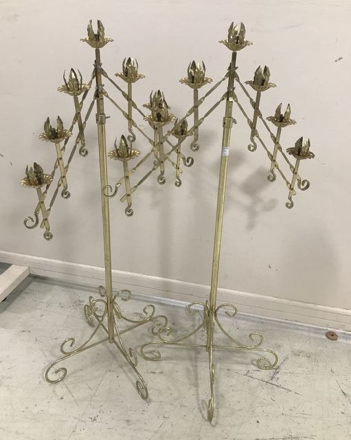 Two Brass Color Candle Stands, adjustable height, 7 candle holder slots. Two Brass Color Candle Stands, adjustable height, 7 candle holder slots.