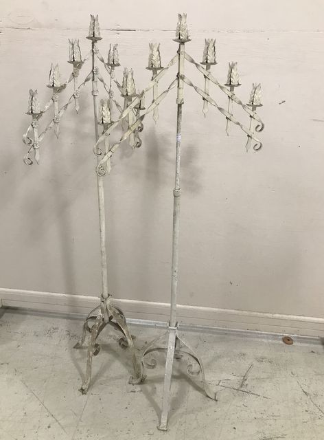 Two White Painted Wrought Iron Candle Stands, adjustable height, 7 candle holder slots. Two White Painted Wrought Iron Candle Stands, adjustable height, 7 candle holder slots.