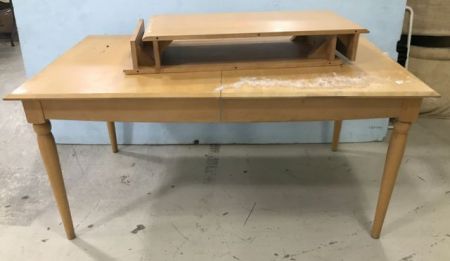 Ethan Allen Blonde Wood Dinning Table, two leaves, top has scuffs and sticky residue on top, 30"h., 64"L., 38"w. Ethan Allen Blonde Wood Dinning Table, two leaves, top has scuffs and sticky residue on top, 30"h., 64"L., 38"w.