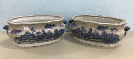 Pair of Modern Blue and White Planters, Oriental style, 6"h., 13"w. Pair of Modern Blue and White Planters, Oriental style, 6"h., 13"w.