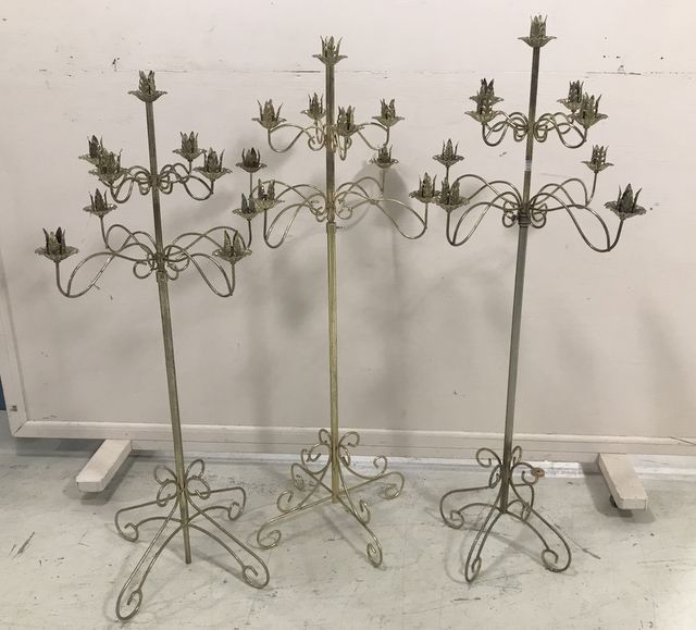 Three Brass Color Candelabra Stands, adjustable height, 8 candle holder slots, one top section is broken from the stand. Three Brass Color Candelabra Stands, adjustable height, 8 candle holder slots, one top section is broken from the stand.