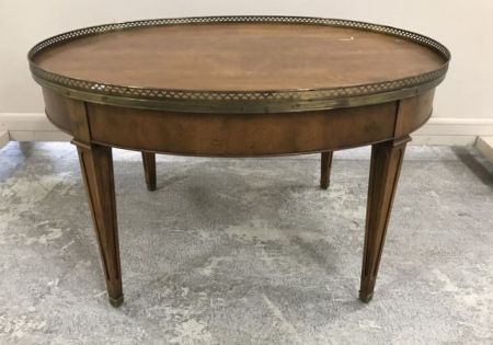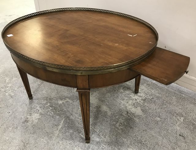 French Provincial Round Coffee Table, brass gallery, two side pull out shelves, has finish wear, 21"h., 35"w., 25"d. French Provincial Round Coffee Table, brass gallery, two side pull out shelves, has finish wear, 21"h., 35"w., 25"d.